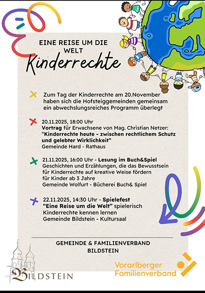 Zum Tag der Kinderrechte am 20. November haben sich die Hofsteiggemeinden gemeinsam ein Abwechslungsreiches Programm überlegt, mit einem abschließenden Spielefest in Bildstein, Kultursaal.