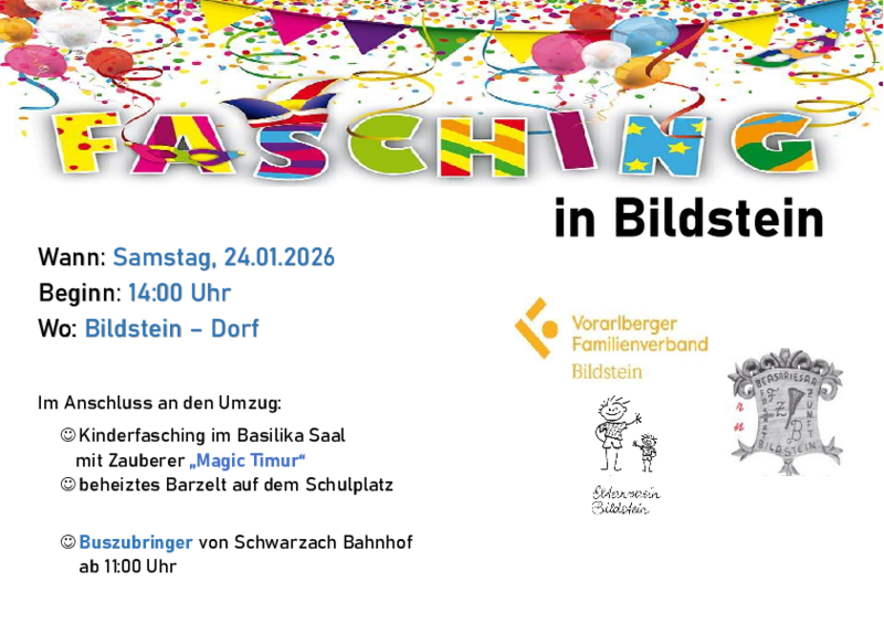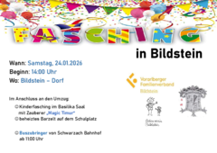 Am Samstag, 24.01.2026 findet wieder der Faschingsumzug und mit anschließendem Kinderfasching im Basilikasaal, Bildstein statt.